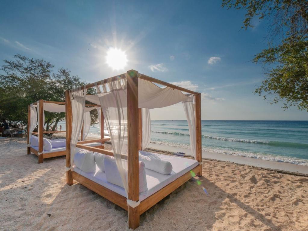 Den hvide sandstrand ligger direkte foran resortet – her kan I slentre, bade eller lade jer fascinere af horisontens udsigt.