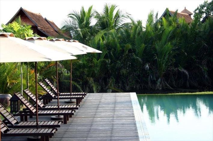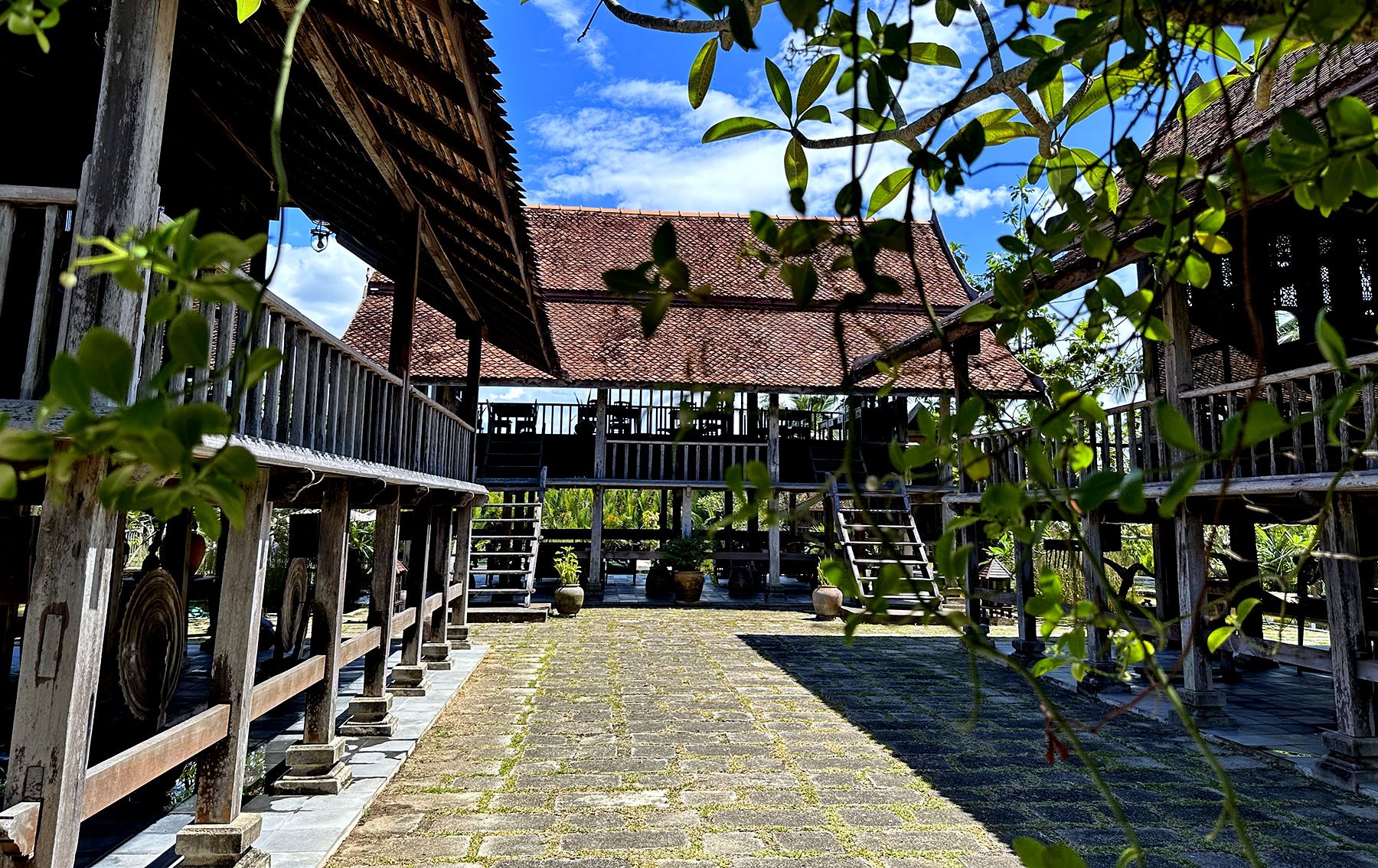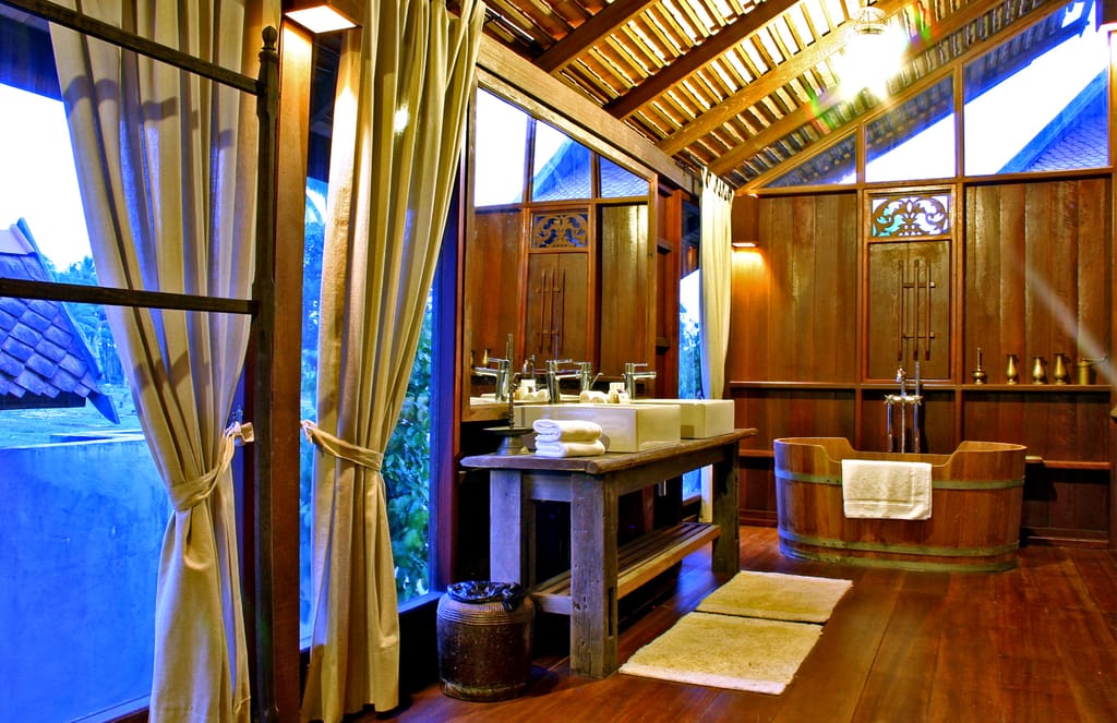 Indretningen er enkel, men dybt stemningsfuld. Himmesenge i mørkt træ, håndvævede tekstiler og antikke møbler skaber en rolig varme, der indbyder til nærvær og fordybelse. Mange af rummene åbner sig mod små terrasser eller grønne gårdrum, hvor lyset filtreres blødt gennem palmer og bananblade. Badeværelserne er rummelige og åbne mod naturen, med fritstående badekar og stenbelagte gulve, der giver en følelse af at bade under åben himmel.