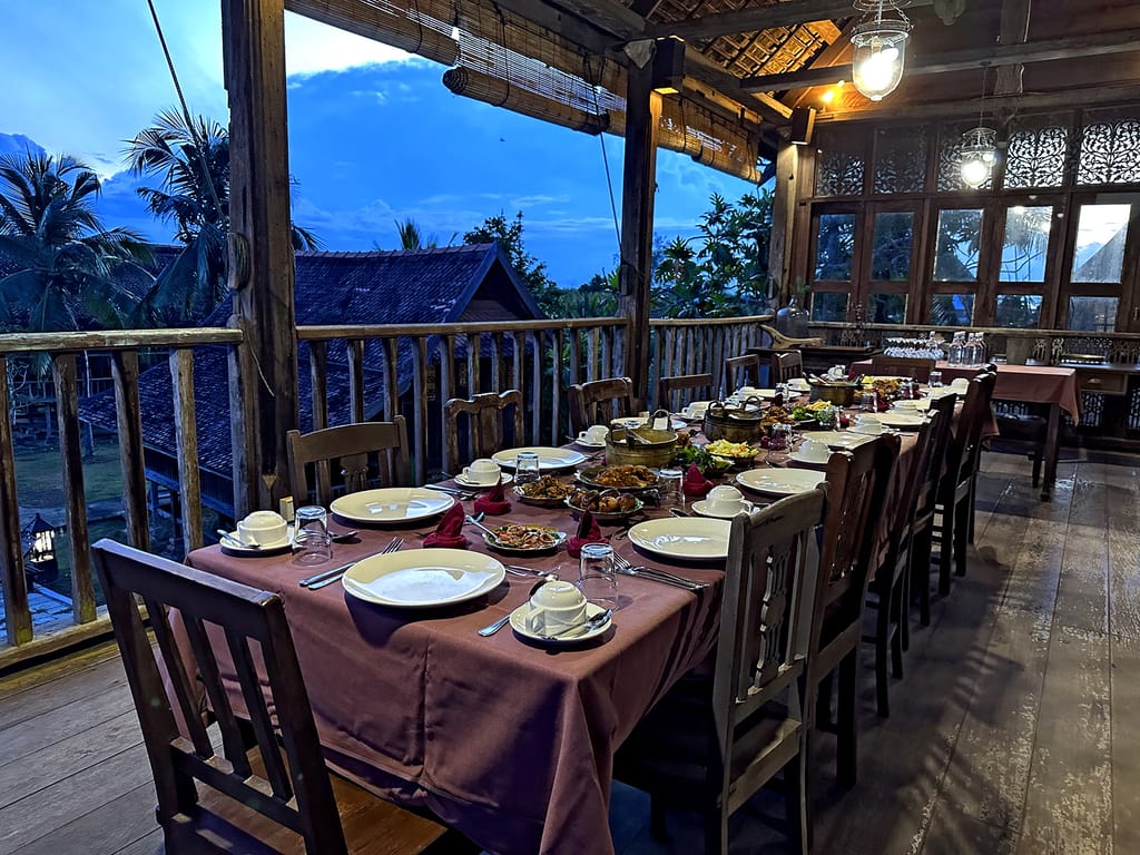 Måltiderne serveres i den åbne gårdhave Sesayap Courtyard, hvor duften af ris og friske krydderurter breder sig fra køkkenet. Retterne tager udgangspunkt i gamle kongelige opskrifter fra Terengganu-regionen og tilberedes med lokale råvarer – frisk fisk fra kysten, kokos, ris og frugter fra nærområdet. Omgivelserne gør hvert måltid til en stille ceremoni under åben himmel.